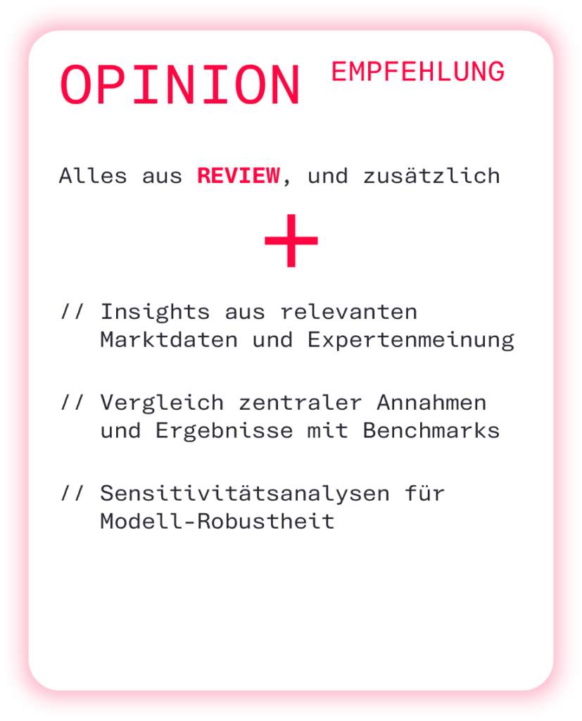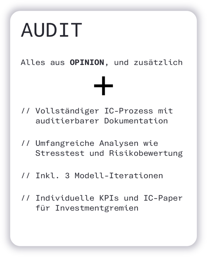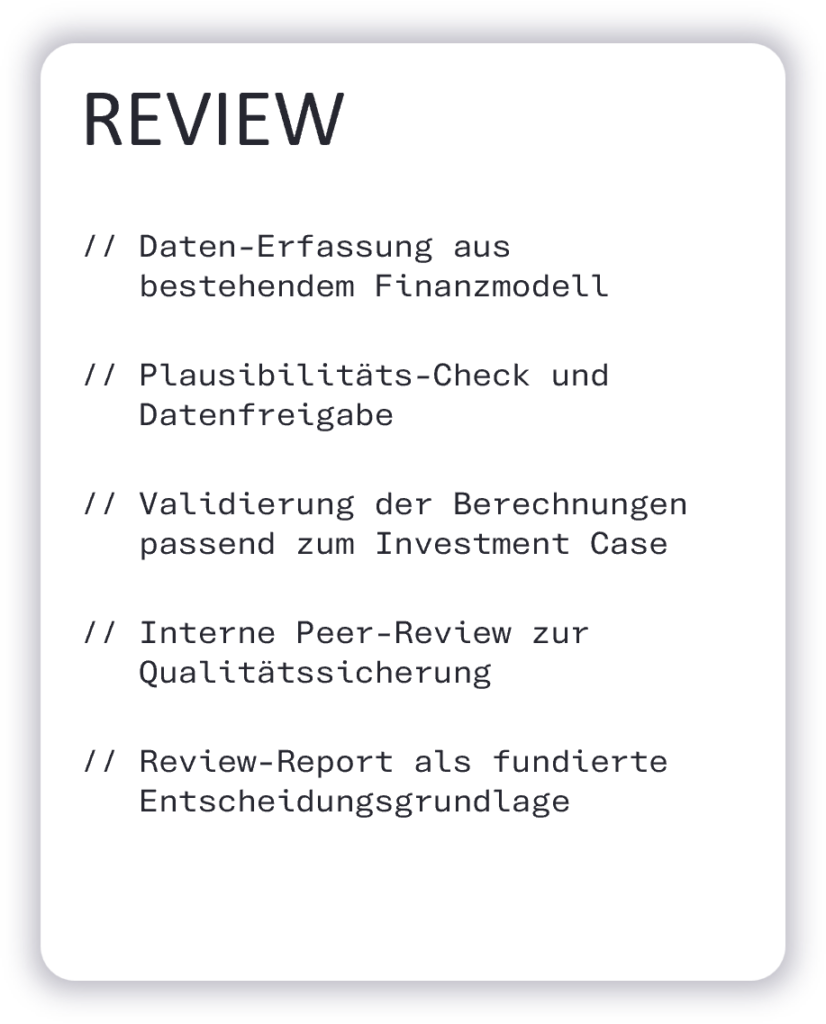 REVIEWS Individuelle und tiefgehende Model Reviews Jedes Investment folgt seinen eigenen Regeln. Um einen maximal effizienten und gleichzeitig individuellen Prozess anbieten zu können, ist unsere Dienstleistung in Paketen und Modulen strukturiert. Projekt Anfragen